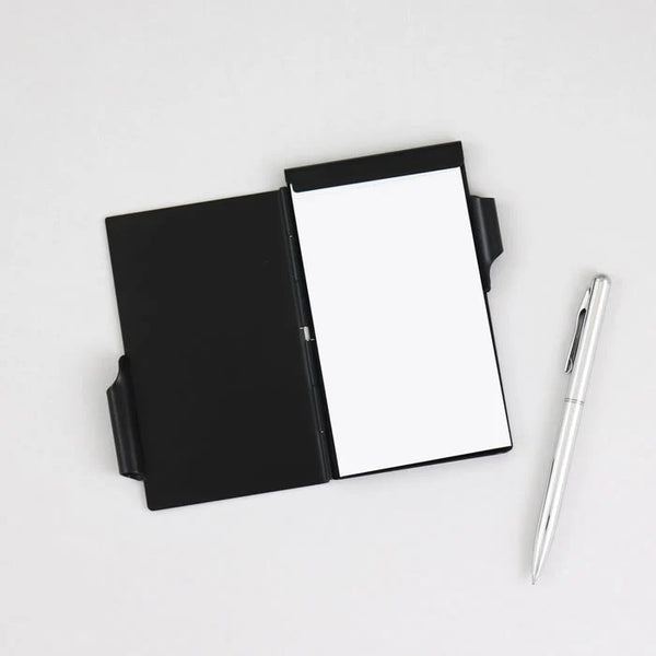 You will wonder how you ever lived without our best-selling Flip Note. We have thought of everything on this handy note pad. The blank note pad has a metal case- keeps edges from ruffling and tearing, and a handy retractable pen which keeps the protective cover in place. Slide the pen up and the cover flips open. Note pad is perforated- no messy tears. Flip Notes are great for purses, backpacks and briefcases- to jot notes wherever you are and when only a quick note will do. Pen replacement and pad refills available.