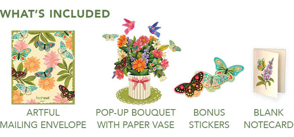 The Pop-Up Enchanted Garden Bouquet is a whimsical celebration of nature’s magic. This arrangement brings flowers and fluttering butterflies to life. Perfect for adding a touch of wonder and joy to any space or gift, it captures the beauty of a blooming garden in full flight. Includes colorful butterfly stickers with gold foil!