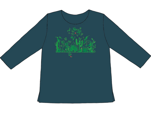 Ladies 3/4 Sleeve Top- (3/4s) Our own flattering missy cut, hemmed below the hip with a scoop neckline, side vents and bracelet length sleeves. Made in the USA of soft 100% garment dyed cotton. Medium approximately 28" long and 21" wide at the under arm. Moroccan Blue.